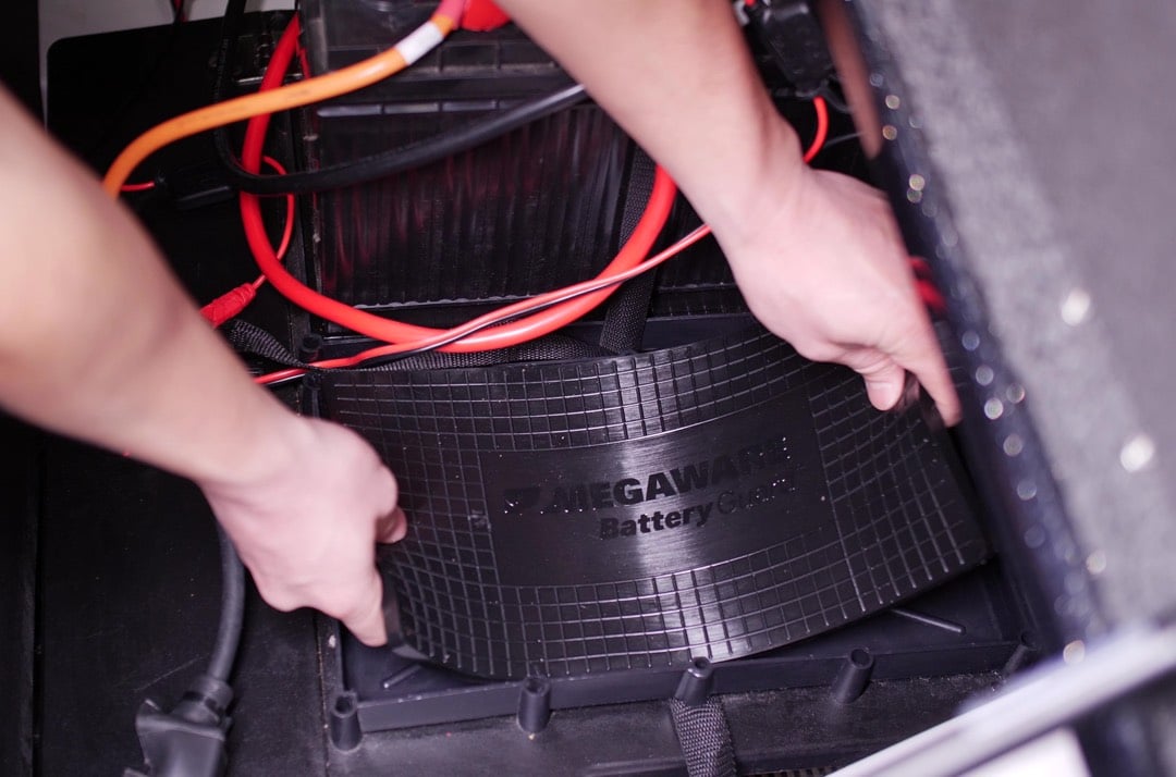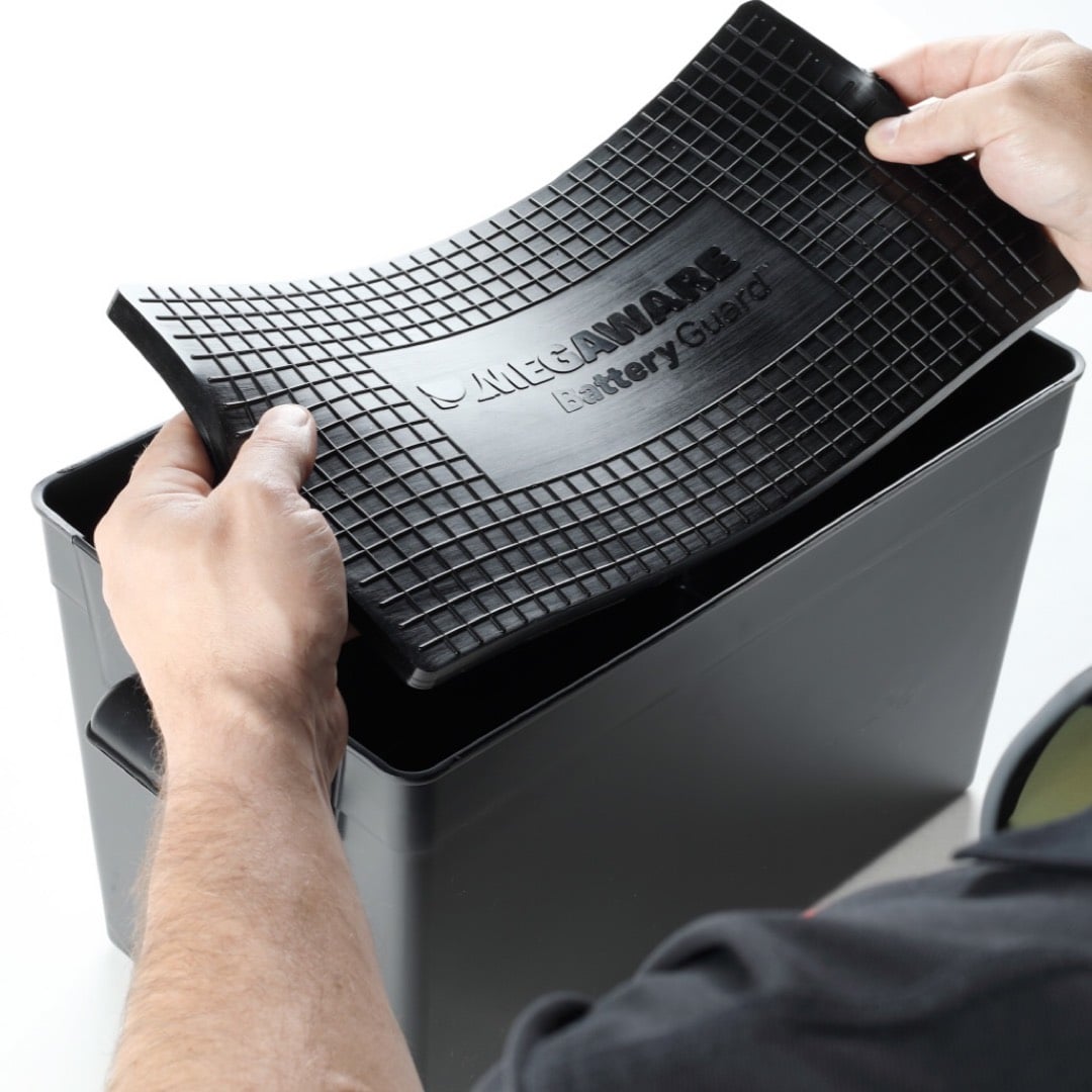 Megaware BatteryGuard ™ is a shock-absorbing mat that extends battery life by reducing damage from vibration and shock, absorbing up to 80% of G-shock from rough terrain, water, or mechanical vibrations.